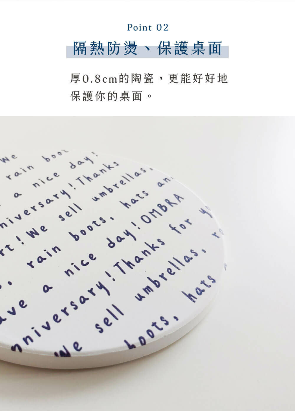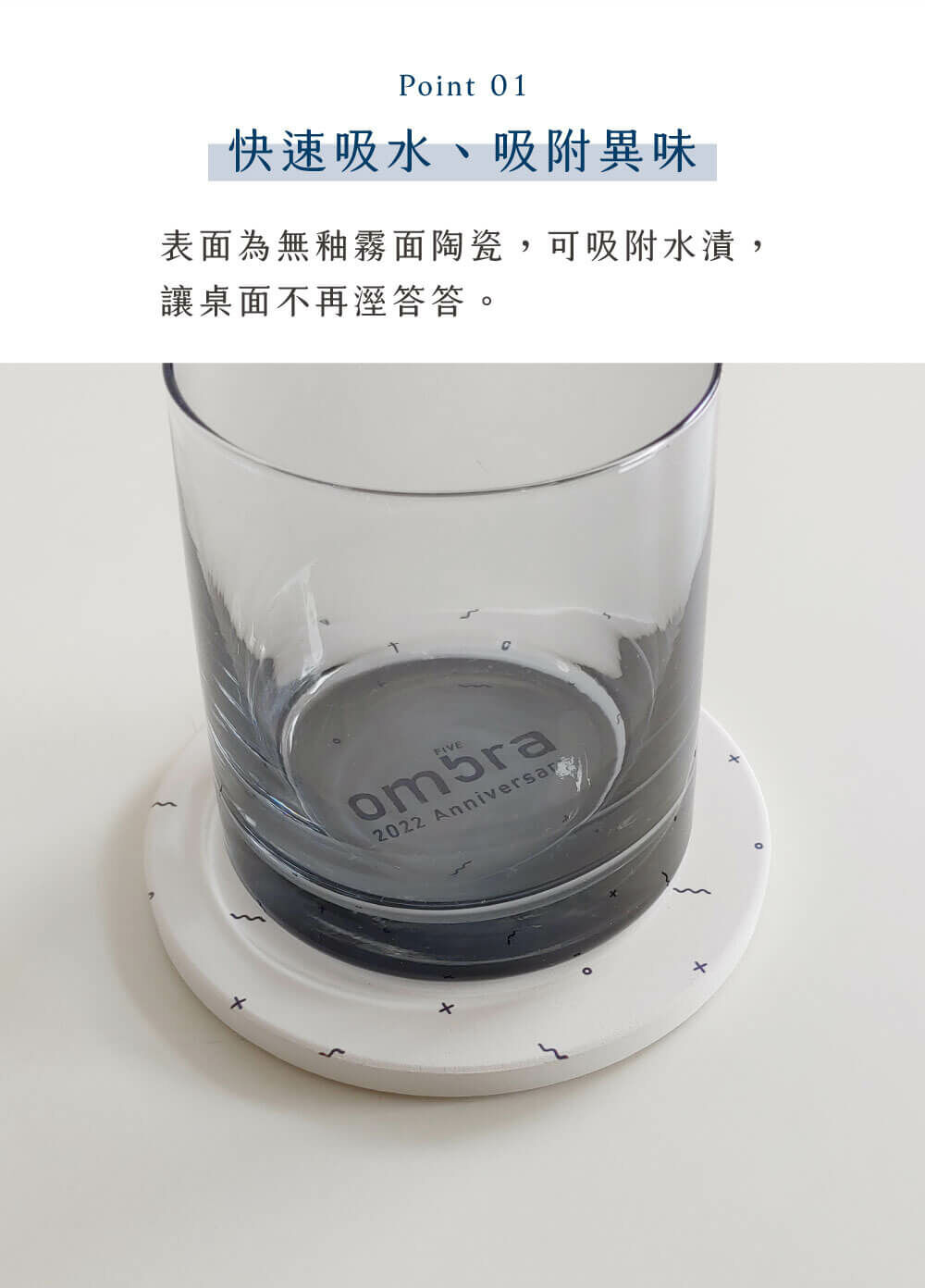 表面為無釉霧面陶瓷,可吸附水漬,讓桌面不再溼答答。